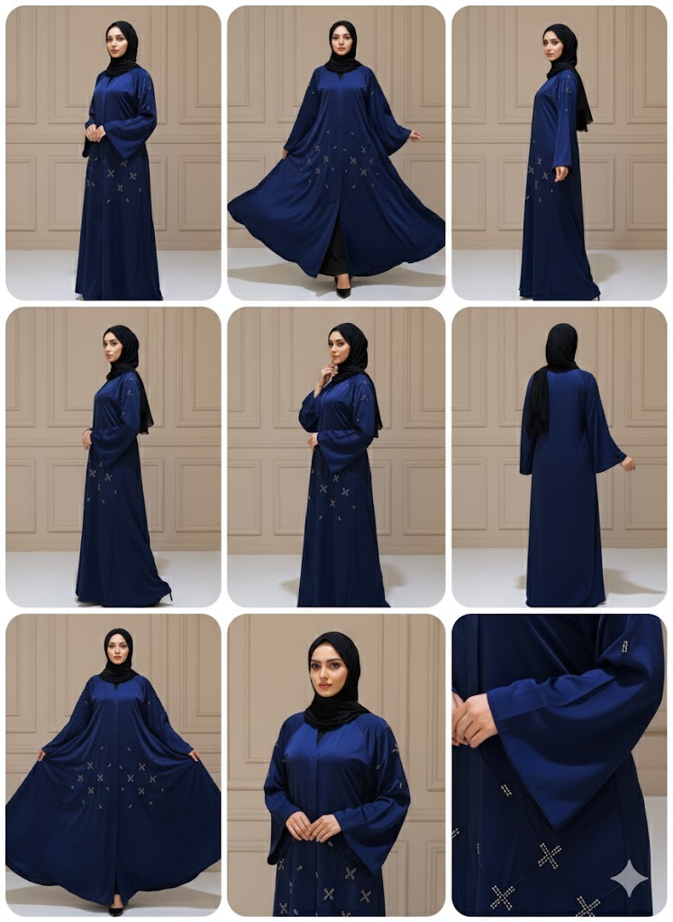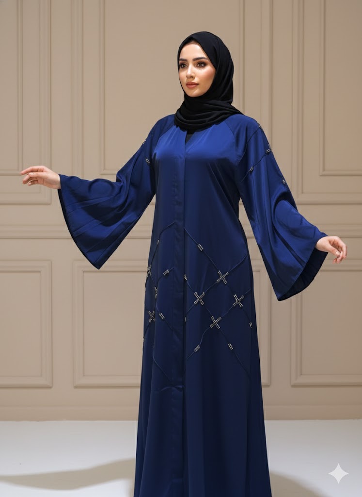 هذه العباية تجمع بين التصميم الكلوش الواسع الذي يمنحك انسيابية مميزة، وتطريزات العقيق الراقية التي تضيف لمسة ملكية على الإطلالة. مصنوعة من قماش الكريب المعروف بخفته وفخامته ومظهره المتناسق.