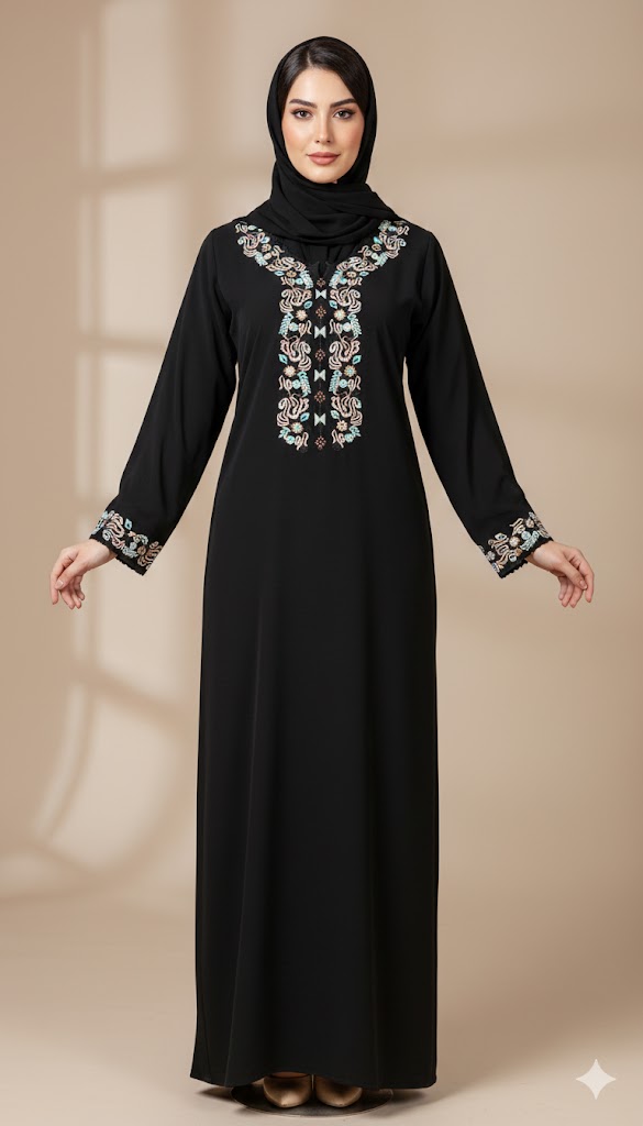 قفطان مصمم بخامة الكريب الناعمة والمتناسقة، مزين بـ راندة مغربية أصيلة مع طرزة دقيقة في الصدر واليد، ليمنحك حضورًا راقيًا في جميع مناسباتك.